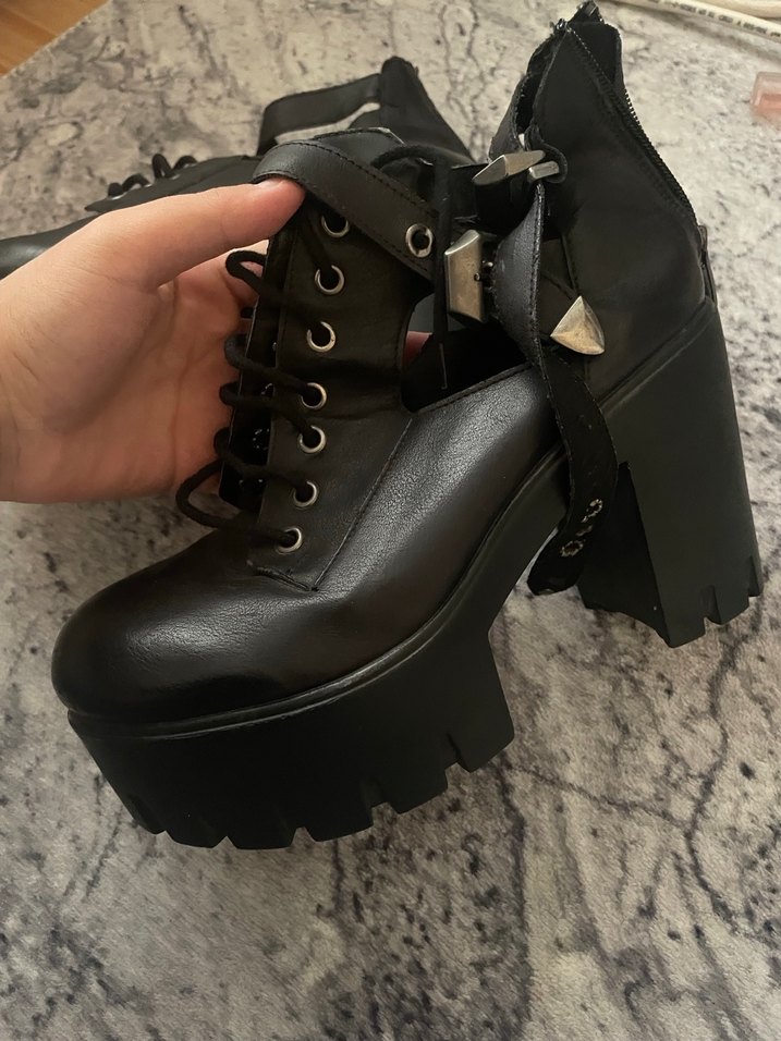 Siyah deri gotik botlar, platform topuk ve tokalı kayışlarla, bağcıklı ön ve kalın tabanlı, rock punk havası verir.