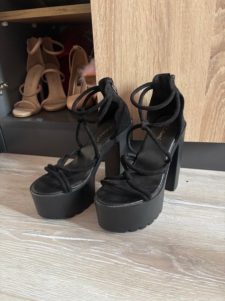 Siyah platform topuklu, cesur gotik tarzda kadın ayakkabısı. İPLİ MODEL AYNISININ SIFIRI SAYFAMDA MEVCUT. Bİ KEZ GİYDİM ARTIK YAŞADIĞIM YERİN YOKUŞLU VE ÇAKILLI YOLLARI BU AYAKKABIYI GİYMEME UYGUN OLMADIĞI İÇİN YER KAPLAMAMASI ADINA GÖZDEN ÇIKARIYORUM. 36 GİYİYORUM NORMALDE AMA BUNUNLA DA RAHAT ETMİŞTİM