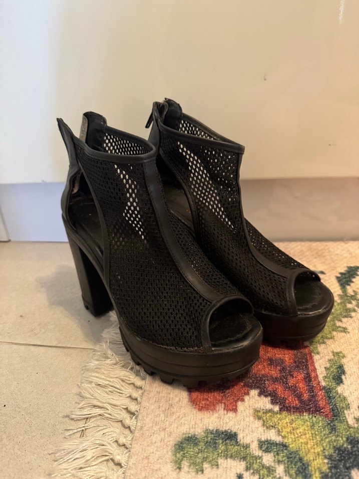 Siyah platform topuklu, desenli file detaylı, tokalı ve kauçuk tabanlı gotik tarz kadın ayakkabısı.