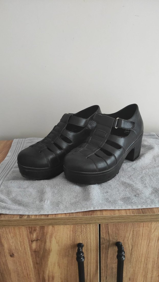 Siyah platform topuklu, tokalı kayışlı, kauçuk malzemeden yapılmış gotik tarzda kadın ayakkabısı. Günlük kullanıma uygun ve trend bir model. hakiki Deri