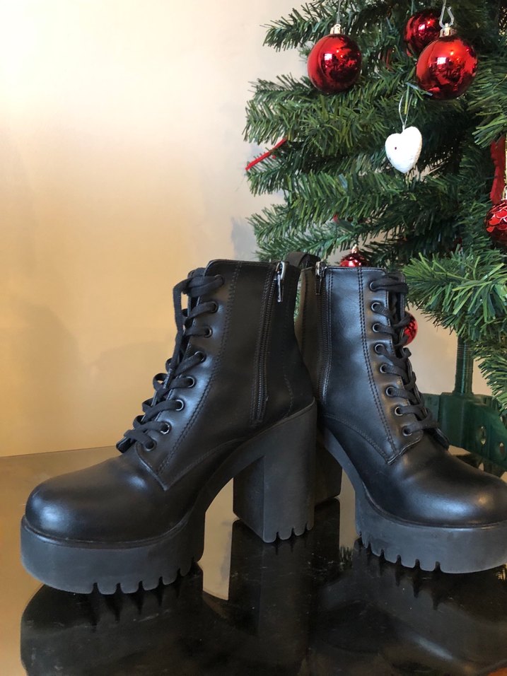 Siyah kauçuk malzemeden yapılmış, platform topuklu, tokalı ve desenli gotik tarzda kadın botları.