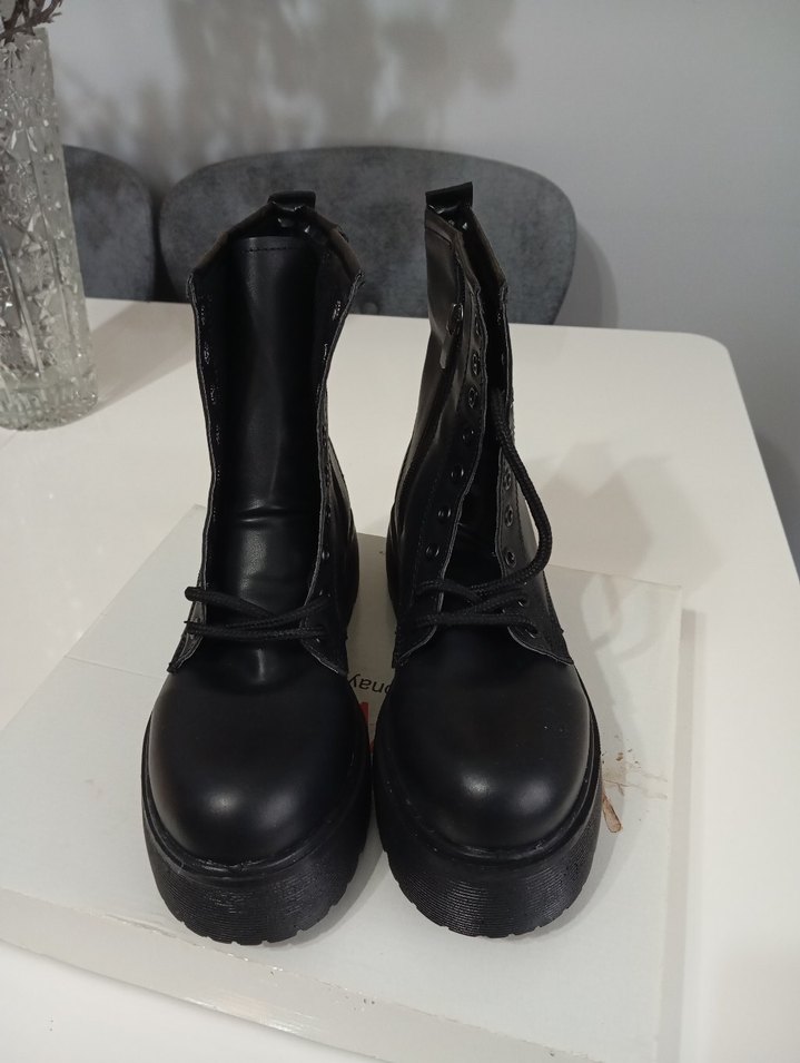 Siyah kauçuk gotik botlar, platform topuklu ve tokalı detaylara sahip, günlük kullanım için rock punk havası verir.