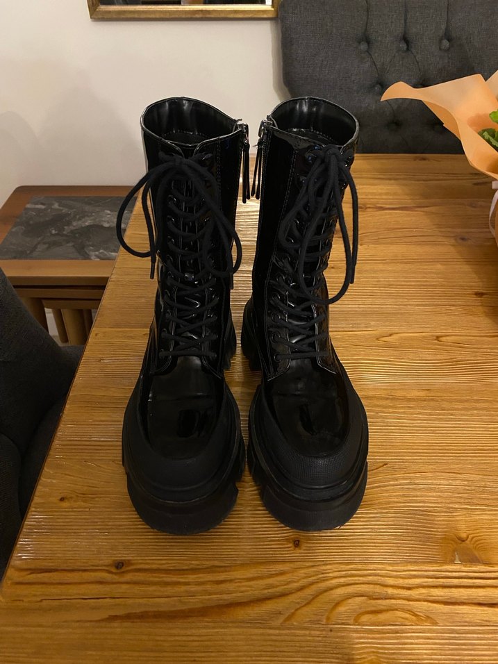 Siyah kauçuk botlar, platform topuk, bağcıklı ön ve tokalı detaylarla gotik rock punk tarzını günlük kullanıma yansıtıyor. Sadece arka kısmında çok küçük açılma var ayakkabıcıda hemen halledilir