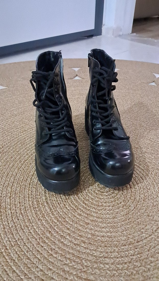 Siyah, bağcıklı ve tokalı platform topuklu botlar, kauçuk malzemeden. Gotik tarzda, rock punk havası için uygun günlük kullanıma.