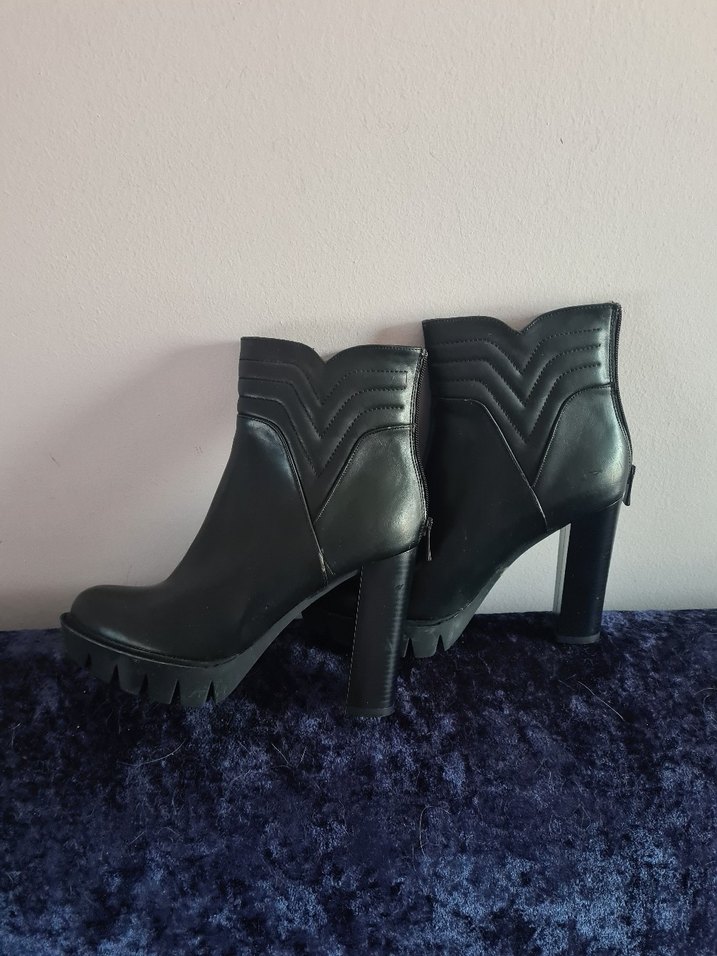 Siyah platform topuklu, desenli ve tokalı gotik tarzda kadın botları, günlük kullanıma uygun kauçuk malzemeden üretilmiştir.topuk boyu 12 cm