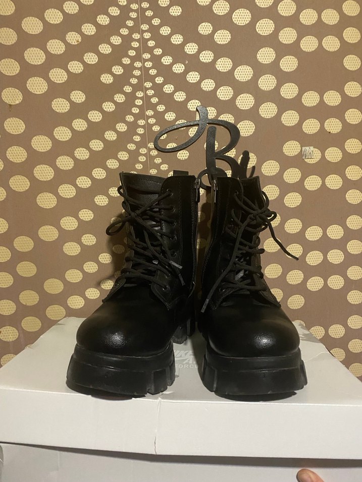 Siyah kauçuk platform topuklu, tokalı gotik tarzda kadın botları. Günlük kullanıma uygun, rock punk havası taşıyan koyu renkli model.