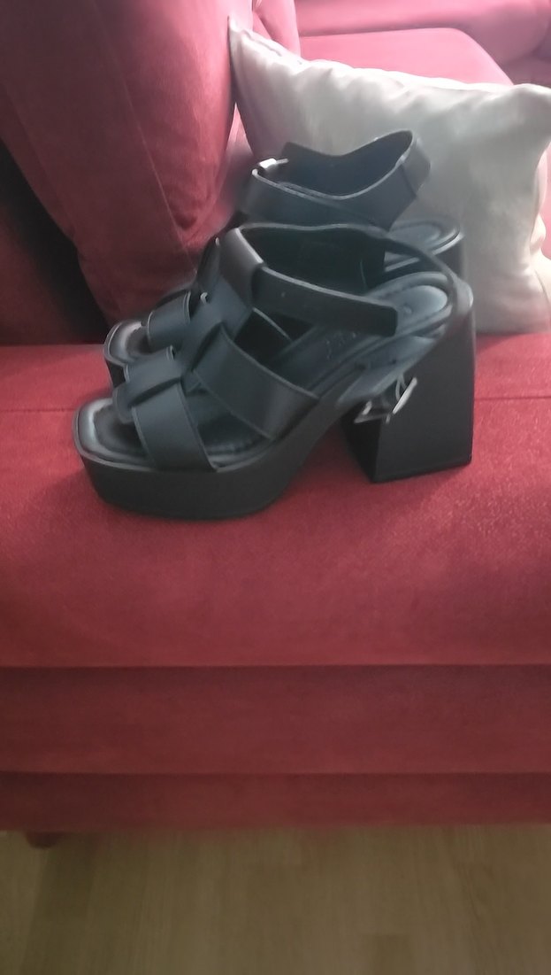 Kauçuk malzemeden yapılmış, tokalı siyah platform topuklu sandaletler. Günlük kullanım için cesur gotik stile sahip.hic giyilmedi