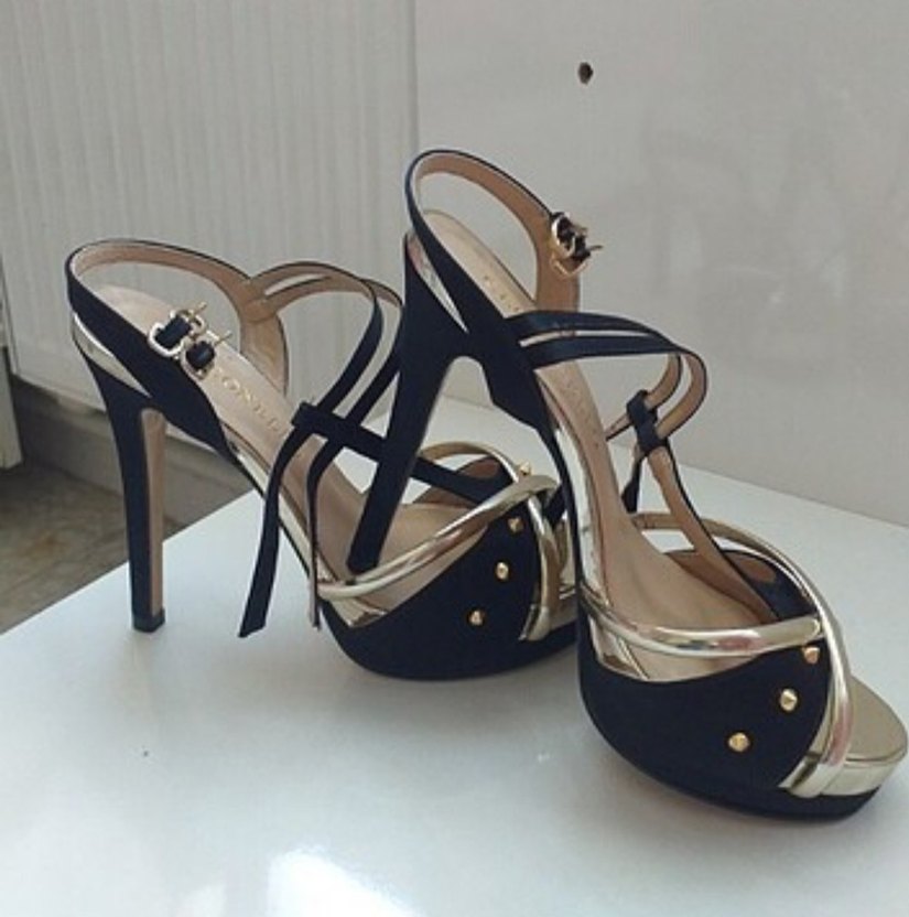 Siyah platform topuklu, tokalı kayışlara ve baskılı detaylara sahip, romantik akşamlar için uygun çağdaş tarzda ayakkabı. Kauçuk malzemeden üretilmiştir.