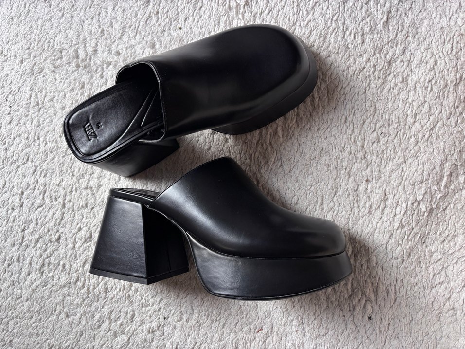 Siyah, tokalı platform topuklu kadın ayakkabısı. Minimalist gotik tarzda, moda ve ofis kullanımı için uygun.