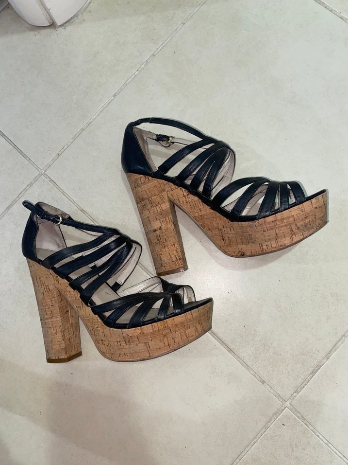 Bej tabanlı kadın platform topuklu ayakkabılar, koyu renk lastik kayışlar ve tokalı kapanışa sahiptir. Topuk boyu 15 cm
