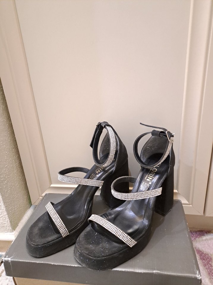 Siyah platform topuklu ayakkabılar, tokalı bantlarla süslenmiş ve romantik gece için uygundur. Kauçuk malzemeden, gri detaylı. Simli taşı topuklu ayakkabı 1 kere giyildi hiç bir sorunu yok pazarlık payı vardır. 37 numara ama 38 numarada giyebilir.