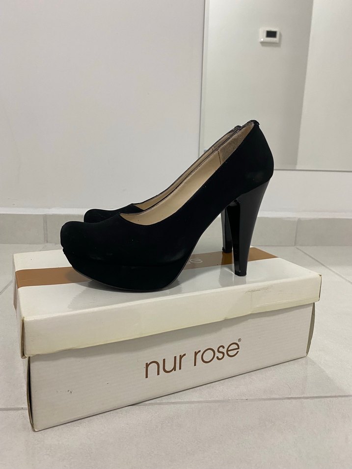 Siyah renkte, platform topuklu ve kauçuk tabanlı kadın ayakkabılar. Minimalist desenli ve ofis için uygun, zahmetsiz şıklık sunar.