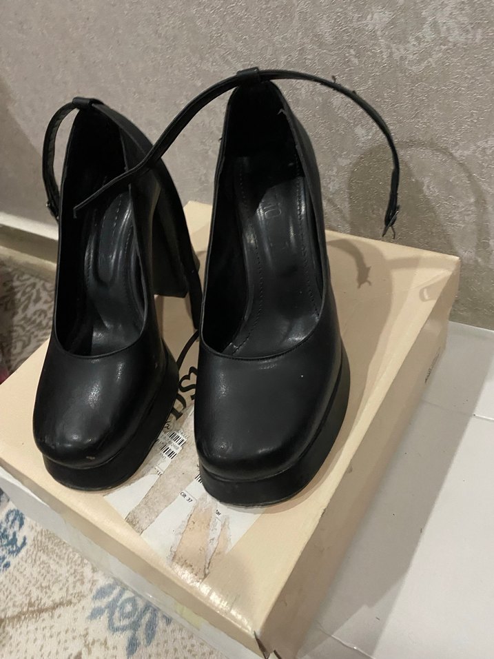 Siyah, tokalı bantlı platform topuklu ayakkabılar. Kauçuk malzemeden, gotik tarzda ve romantik buluşmalar için uygun.