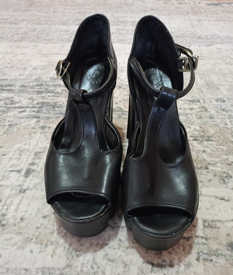 Popiyon 37 numara Siyah platform topuklu ayakkabı, tokalı kayışlı ve cesur gotik tarzda, romantik akşamlar için uygun. Desensiz ve koyu renkte.ayakkabi giyilebilir durumda topuk yüksekliği 11.5 cm bazı yerlerinde hafif soyulma var