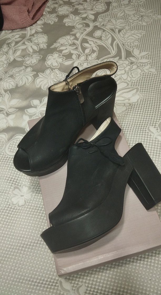 Siyah platform topuklu kadın ayakkabısı, blok topuk ve tokalı detaylara sahiptir. Kauçuk malzemeden üretilmiş, günlük kullanıma uygundur ürün bir kez düğünde kullanıldı