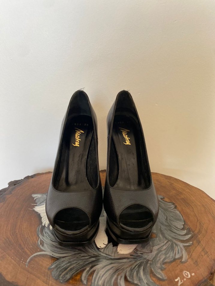 Siyah platform topuklu, deri malzemeden yapılmış kadın ayakkabısı. Ofis için gotik ve şık bir tercih.
