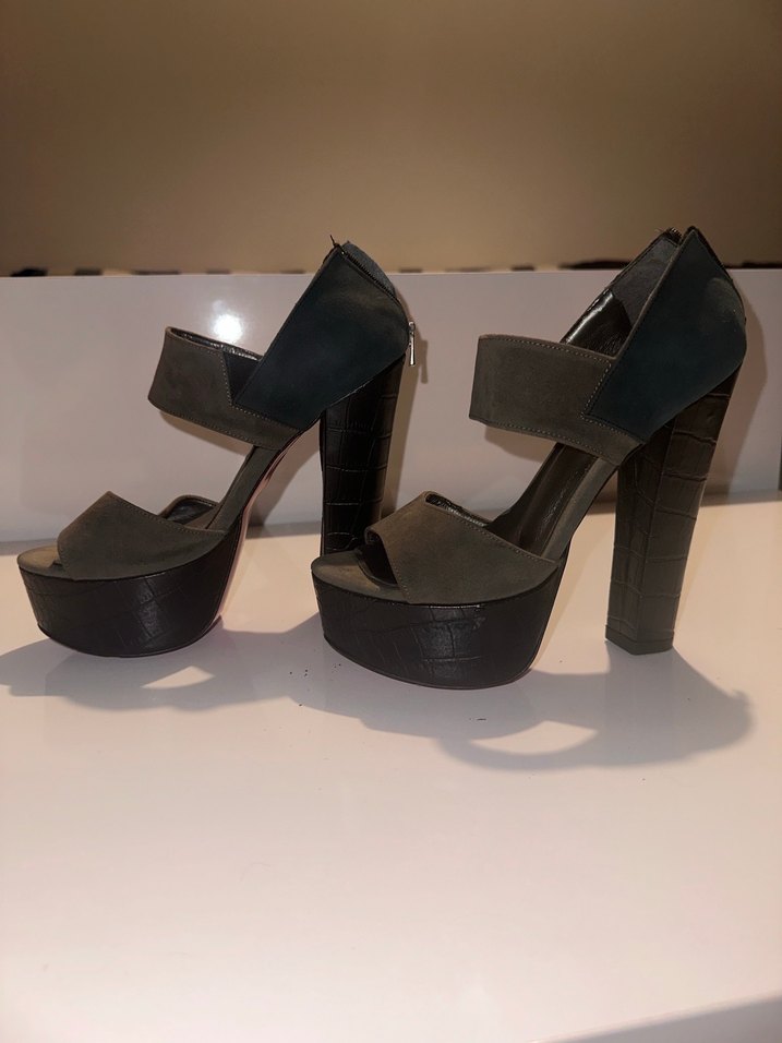 Siyah platform topuklu ayakkabılar, kauçuk taban ve tokalı bantlarla, baskılı desen detaylı. Cesur ve çağdaş tasarım, romantik buluşmalar için uygun. Bazı yerlerinde soyulmalar var