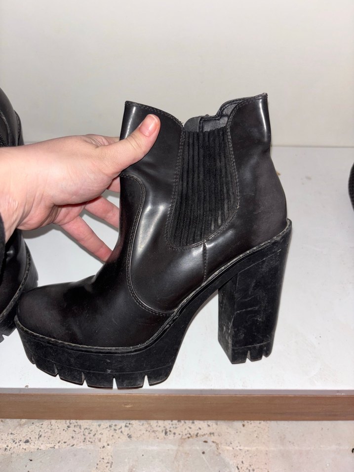 Gri kauçuk kadın botları, platform topuklu ve tokalı detaylara sahip, rock punk tarzını yansıtır ve dış mekan kullanımı için uygundur.