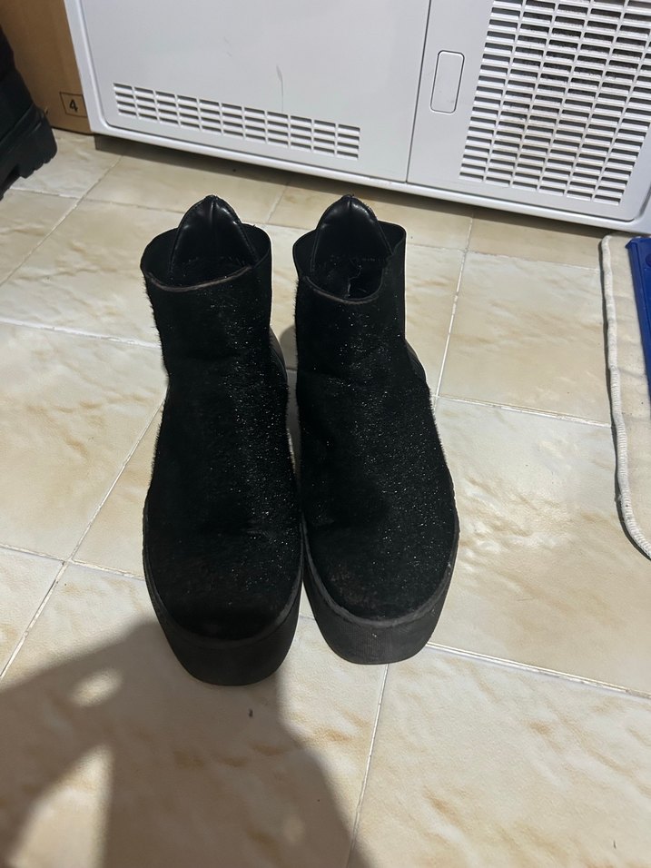 Siyah platform topuklu kadın botları, kauçuk taban ve cırt cırtlı kapanışa sahiptir. Gotik tarzda, rahat ve günlük kullanıma uygundur.