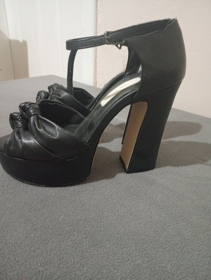 Siyah renkli, tokalı bantlı platform topuklu kadın gece ayakkabısı. Cesur gotik tarzda, romantik akşamlar için uygundur. Kauçuk malzemeden yapılmıştır.