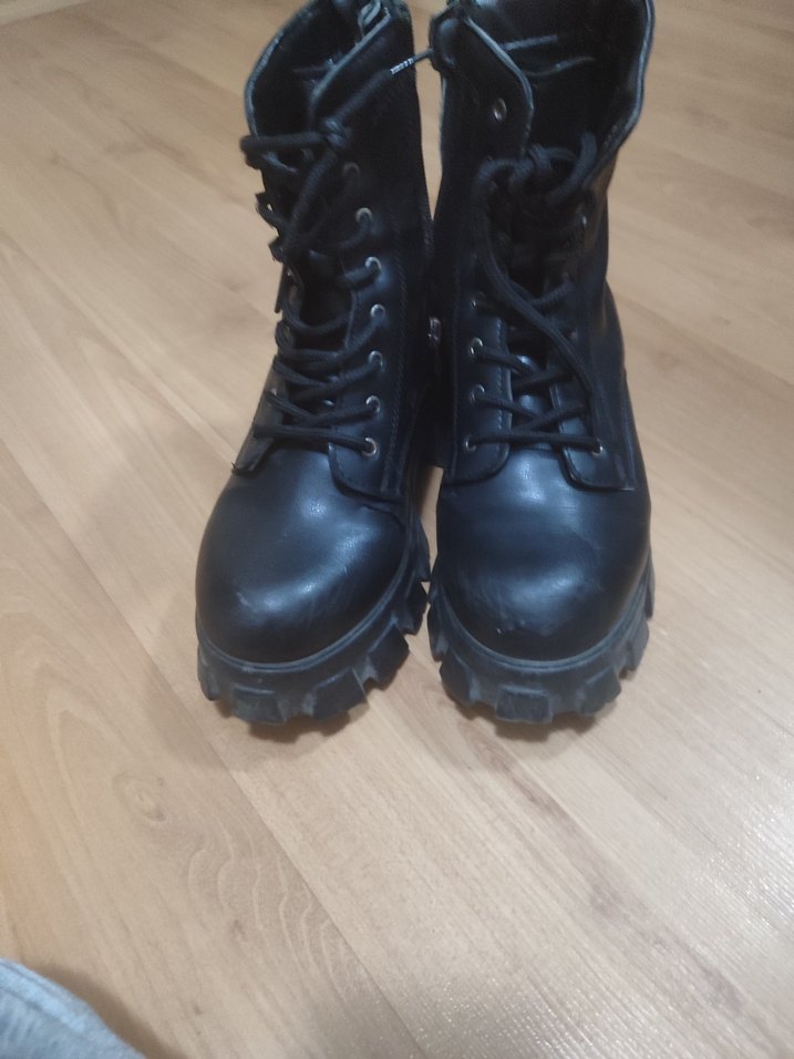 Siyah kauçuk goth botları, platform topuklu, tokalı ve bağcıklı. Rock punk tarzı ve günlük kullanım için uygun.