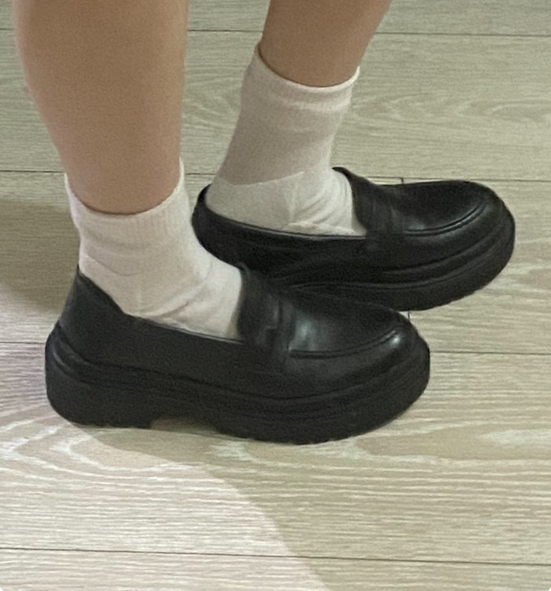 Kauçuk malzemeden yapılmış siyah platform topuklu kadın loaferlar, tokalı tasarıma sahiptir. Minimalist goth tarzıyla günlük kullanıma uygundur.İkinci fotoda gözüktüğü gibi ayakkabının birinin önünde minin bir deforme var .
