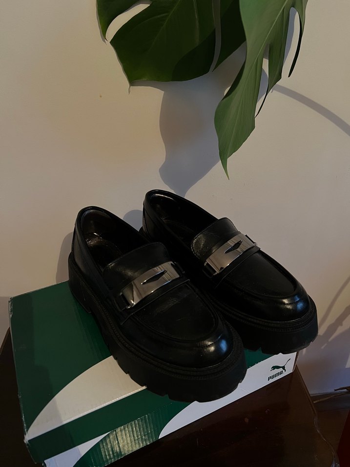 Siyah renkli, tokalı ve platform topuklu kadın loafer ayakkabı. Sadece bir kere kullanılmıştır.