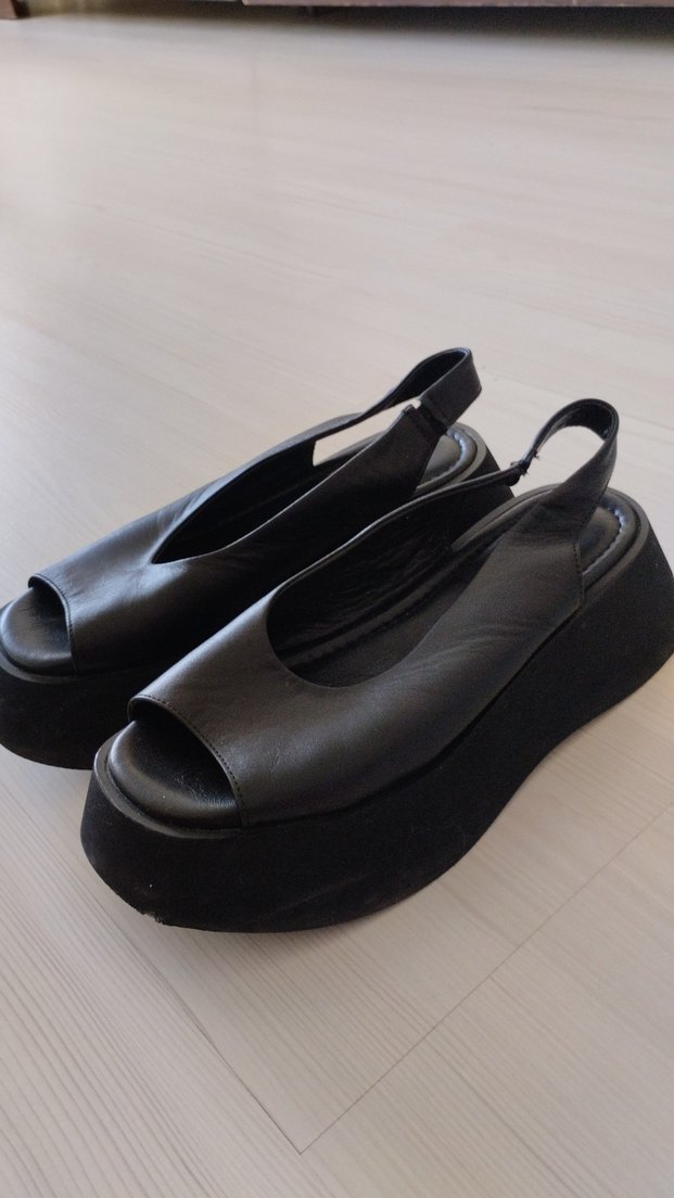 Siyah, tokalı bantlı platform topuklu kadın sandalet. Kauçuk malzemeden, minimalist gotik tarzda, günlük kullanım için uygun. hiç kullanılmadı