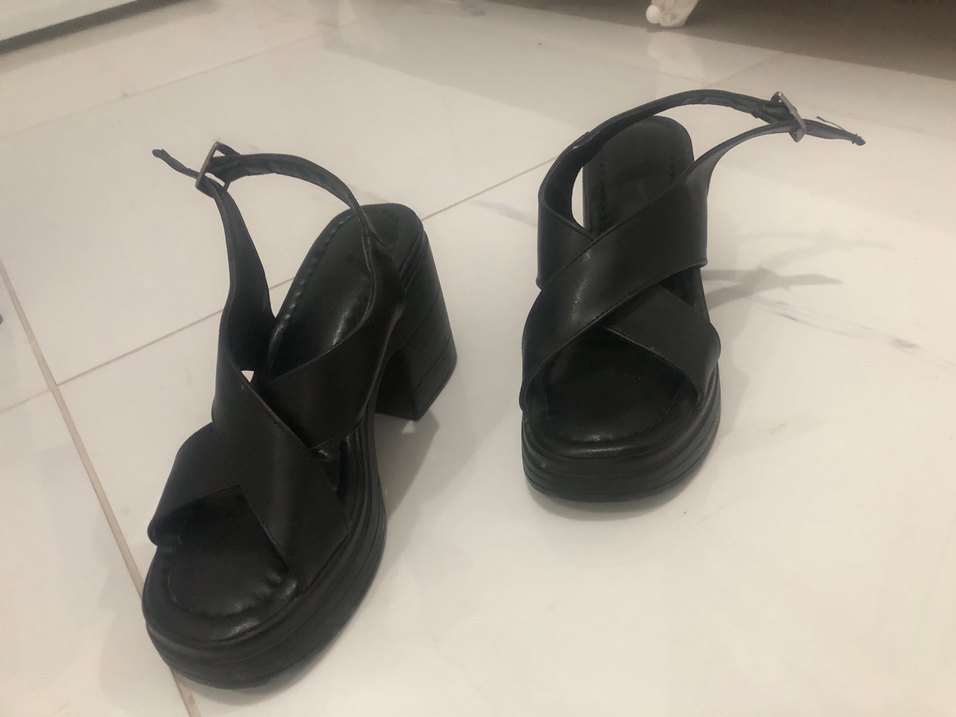 Siyah platform topuklu, kadın sandalet. Suni deri malzemeden yapılmış, minimalist tarzda, günlük kullanıma uygun şık tasarım.