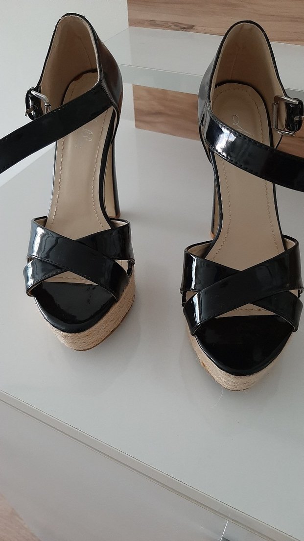 Siyah platform topuklu, tokalı bantlı, çağdaş ve cesur tasarıma sahip. Kauçuk malzemeden, desen içermeyen, günlük kullanıma uygun.