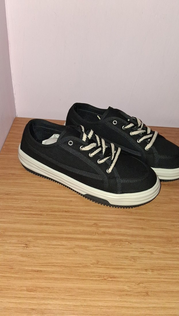 Siyah platform topuklu, kauçuk tabanlı kadın spor ayakkabısı. Spor ve rahat sokak stili için uygundur.