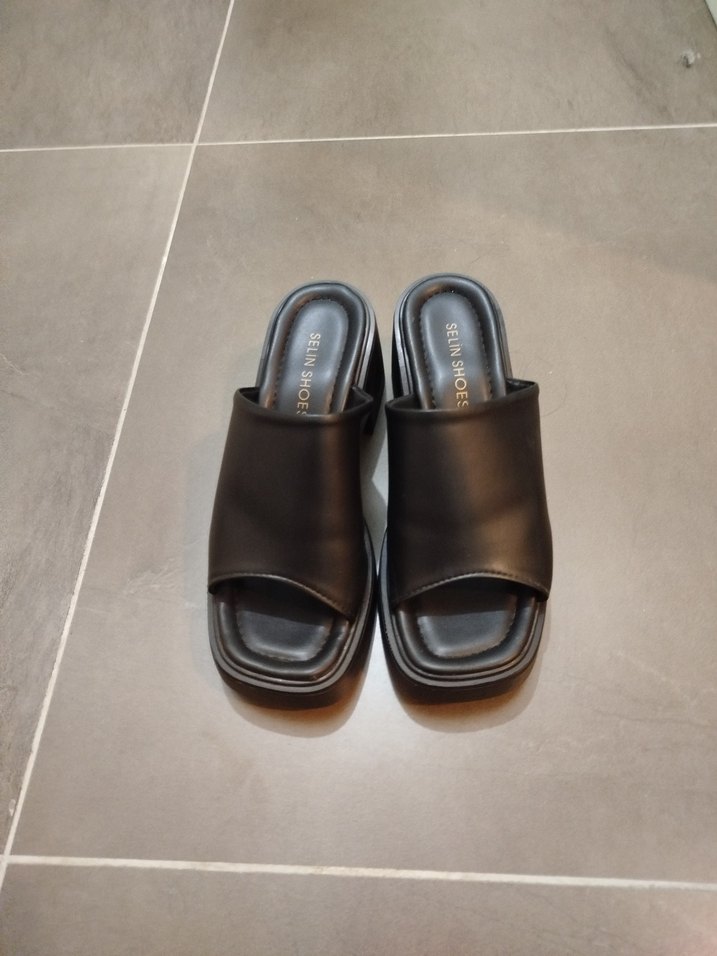 Siyah platform topuklu kadın terlik, tokalı ve kareli desenli, kauçuk malzemeden üretilmiştir. Sokak stili ve günlük kullanım için uygundur.