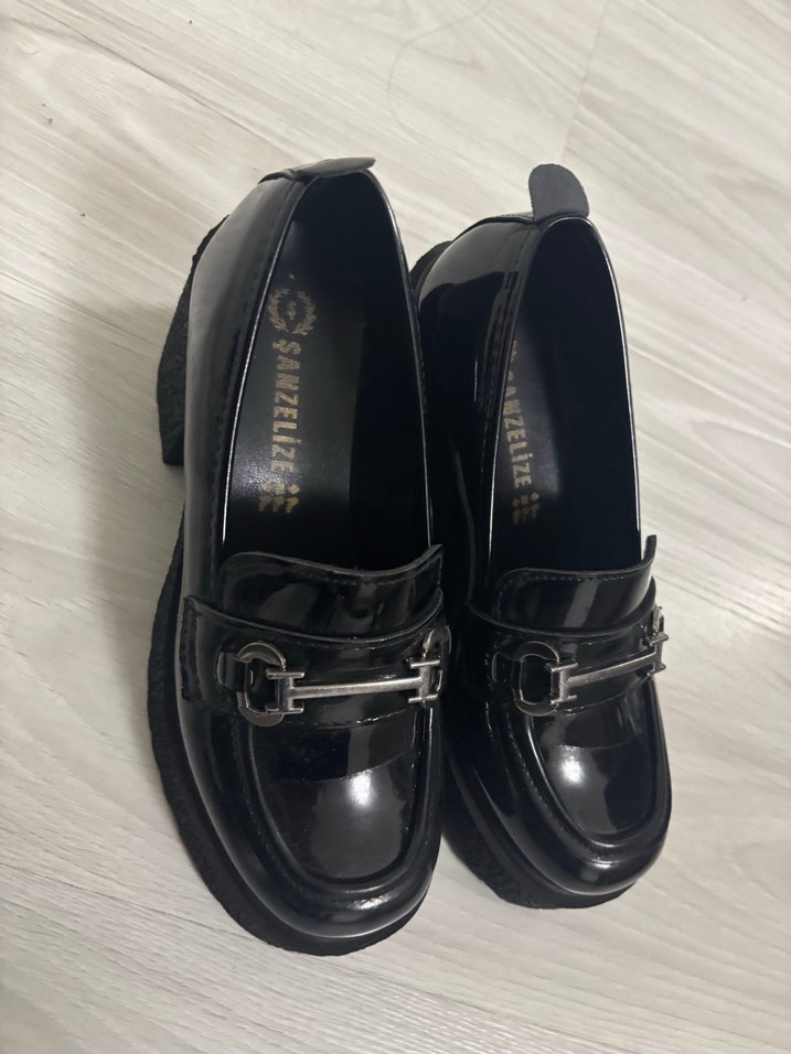 kullanilmadi Siyah parlak kadın loafer, platform topuk ve kilitli detaylı,. Kauçuk malzemeden, ofis ve günlük kullanım için uygundur. Marka: SANZELiZE.