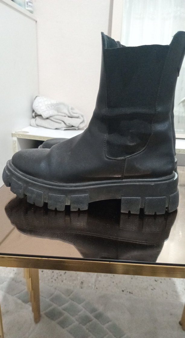 Siyah lastik kadın bot, platform topuklu ve tokalı detaylı, gotik sokak stilini yansıtan günlük kullanıma uygun ayakkabı.