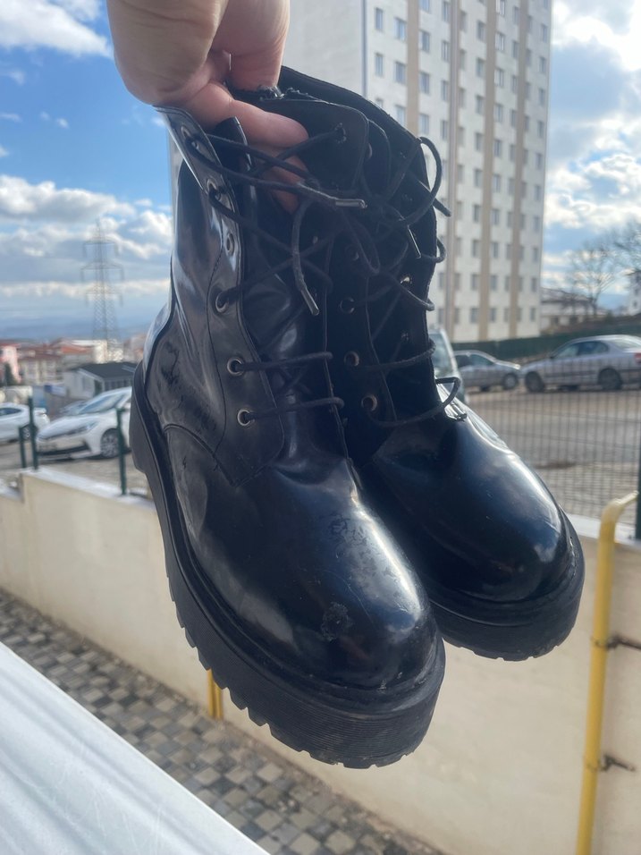Siyah kauçuk materyalli, platform topuklu kadın botu. Grunge punk tarzıyla günlük kullanıma uygun rock punk havası verir.