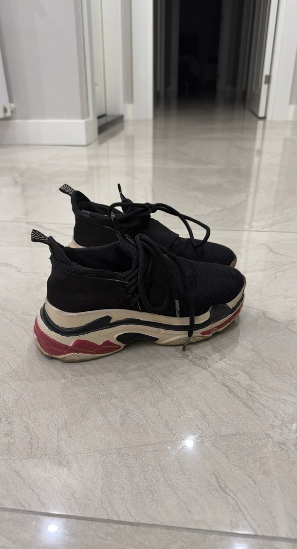 Siyah renkte, elastik üst kısmı ve platform topuklu spor ayakkabılar. Sokak stili için uygun, rahat ve dayanıklı kauçuk tabanlıdır.
