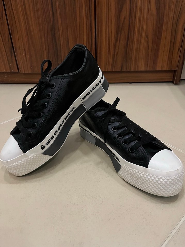 Siyah platform tabanlı, lastik tabanlı spor ayakkabılar. Desensiz tasarımıyla sokak stilini zahmetsiz şıklıkla buluşturur.