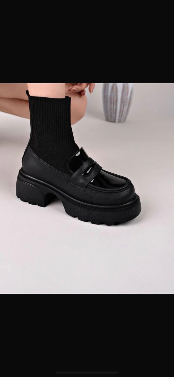 Siyah platform topuklu, tokalı kauçuk kadın loafer. Gotik tarzda, trend günlük kullanım için uygun.