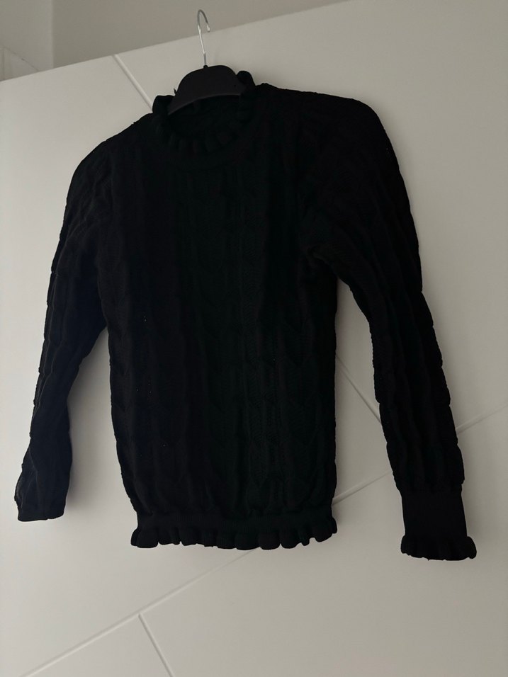 Siyah, balıkçı yaka ve uzun kollu, pliseli detaylara sahip, keten kumaştan yapılmış fitted goth tarzı kazak.
