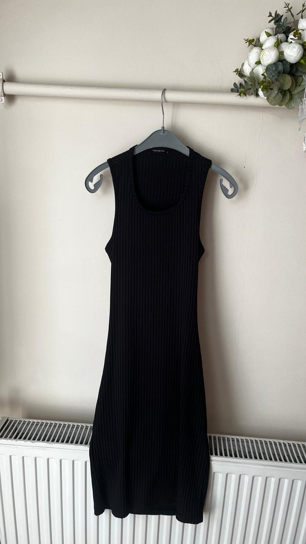 Siyah renkli, yüksek yakalı ve kolsuz bu triko elbise, pliseli detaylara sahiptir. Midi boyda ve sentetik kumaştan üretilmiştir.