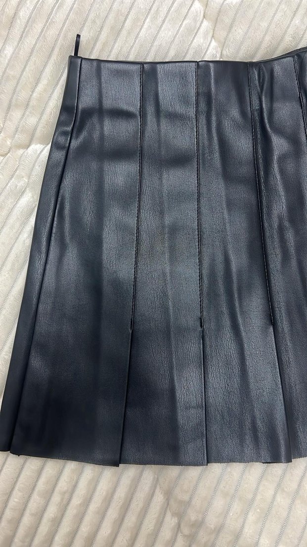 Siyah, fitted, midi boyda ve pliseli bu etek, ofis kullanımı için uygun, yumuşak sentetik kumaştan yapılmıştır.