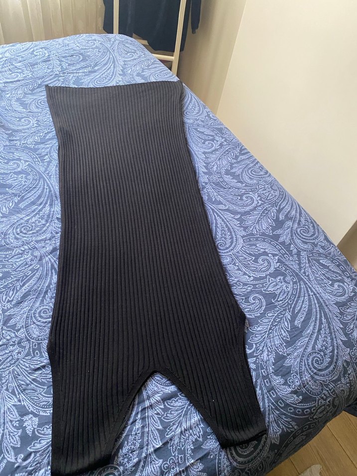 Siyah, bol kesim olmayan, pliseli uzun hamile pantolonu. Rahat sentetik kumaştan, günlük kullanım için uygundur.