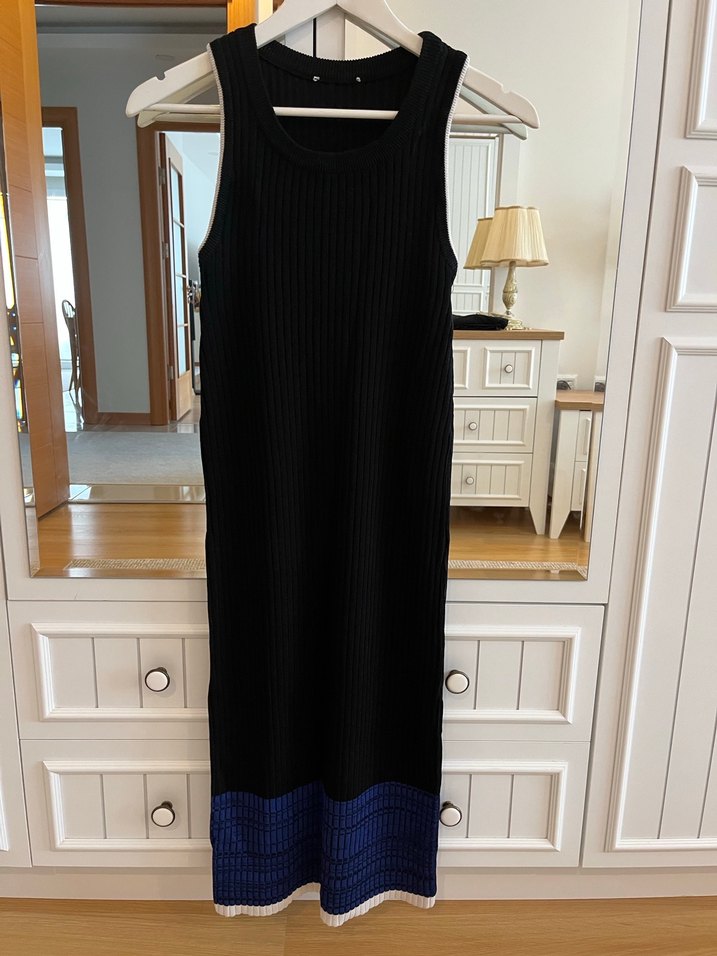 Kolsuz, siyah triko elbise, fitted kesim ve pliseli detaylarla; günlük kullanım için uygun, yuvarlak yakalı, koyu mavi uç kısmı ile şık bir dokunuş sağlar.