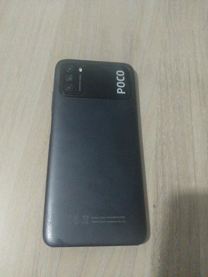 Siyah POCO Android telefon, üçlü kamera ve POCO logosu ile sade ve şık tasarıma sahiptir. az kullanılmış pazarlık var