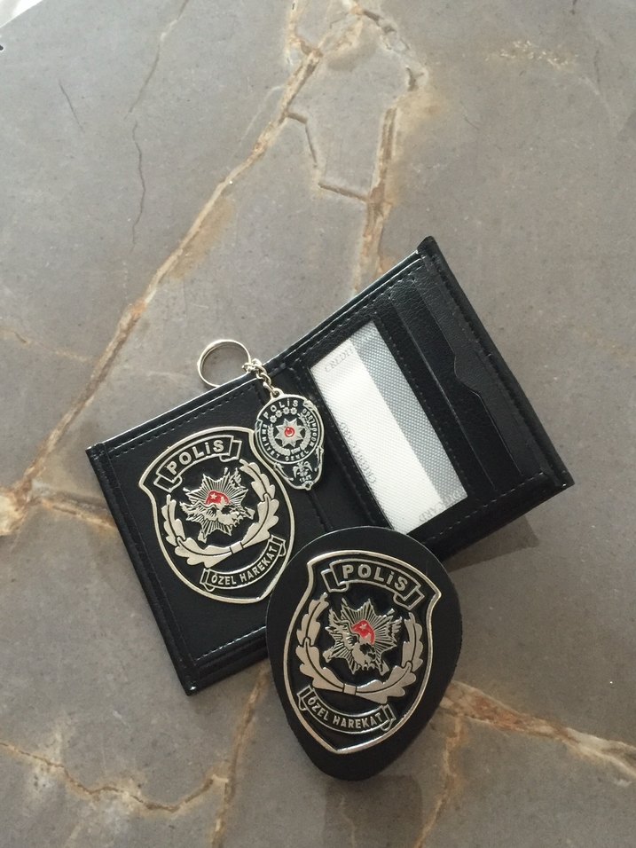 Kartlıklı cüzdan, anahtarlık ve detaylı amblemli rozetten oluşan siyah polis rozet seti. ️