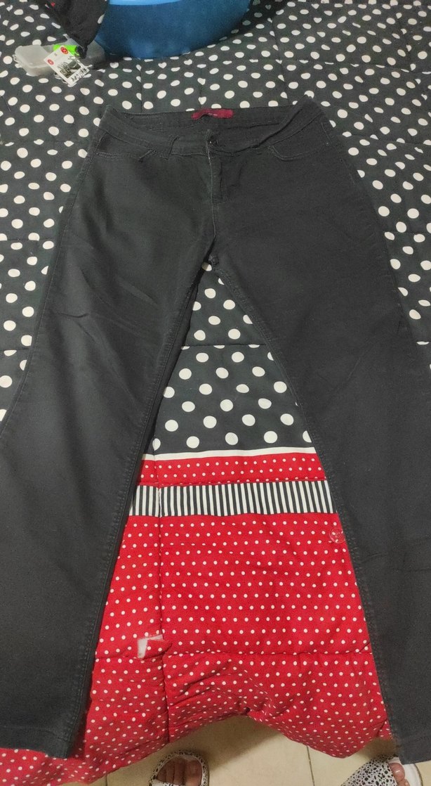 Siyah kadın kumaş pantolon, regular fit ve midi boy, puantiyeli desen ve cırt cırt detaylı, günlük sokak stili için uygun.