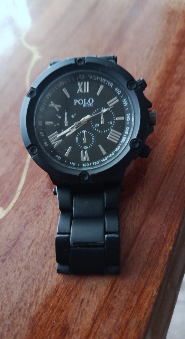 Siyah renkli Polo erkek kol saati, biker tarzında metal kordon ve kadranda takimetre bulunur. Roma rakamları ve çoklu alt kadranlar içerir. ⌚