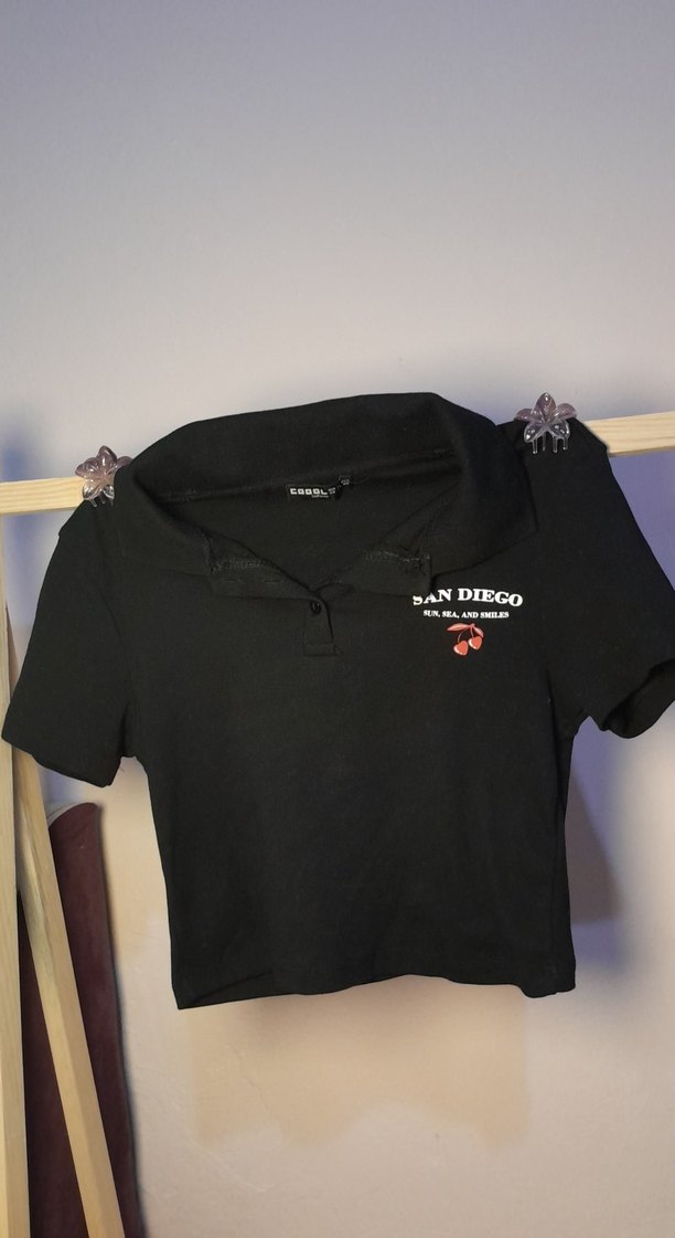 Kısa kollu, düğmeli siyah polo yaka crop 'SAN DIEGO' baskılı, şık ve rahat günlük kullanım için uygundur. kizlad xs ama s ve m ye de rahatlıkla olur