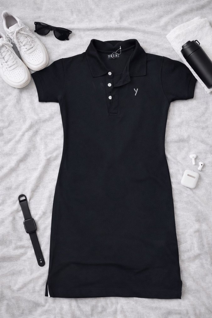 Siyah midi boy, polo yaka ve kısa kollu, sentetik kumaştan üretilmiş, günlük ve şık bir sokak stili elbisedir.