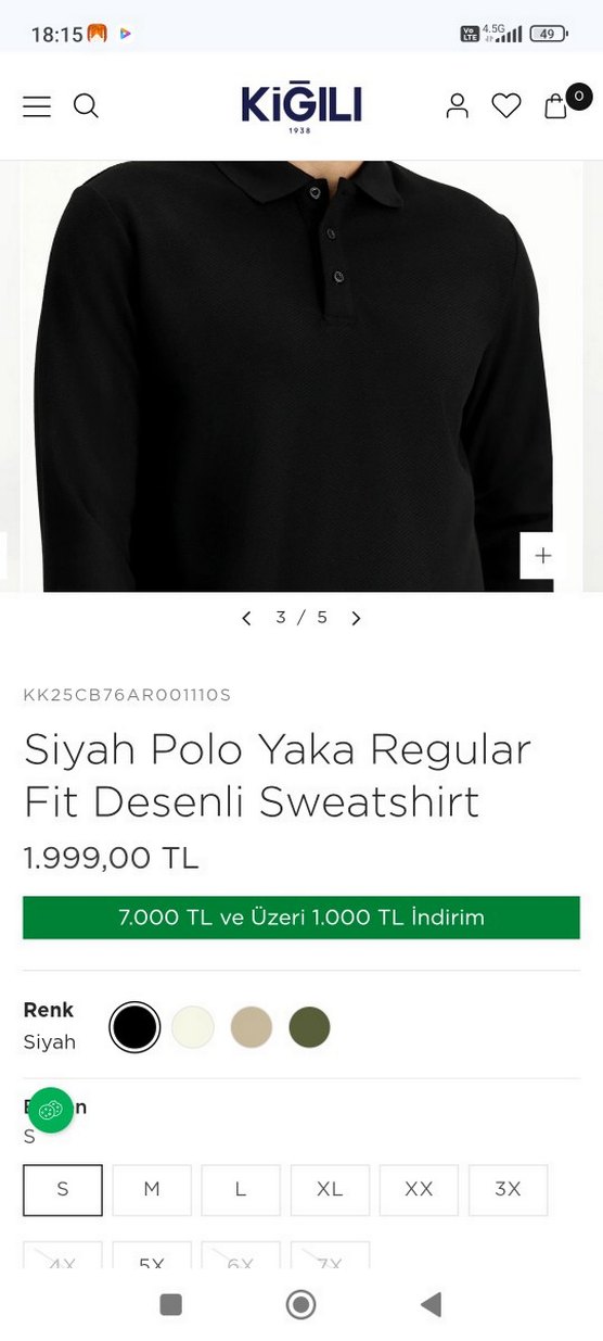 Kigili marka Siyah renk, uzun kollu, polo yaka ve regular fit kesime sahip sweatshirt.pamuklu kumaştan üretilmiş, günlük kullanım için rahat ve şık bir seçenek. yenisi 2 bin tl